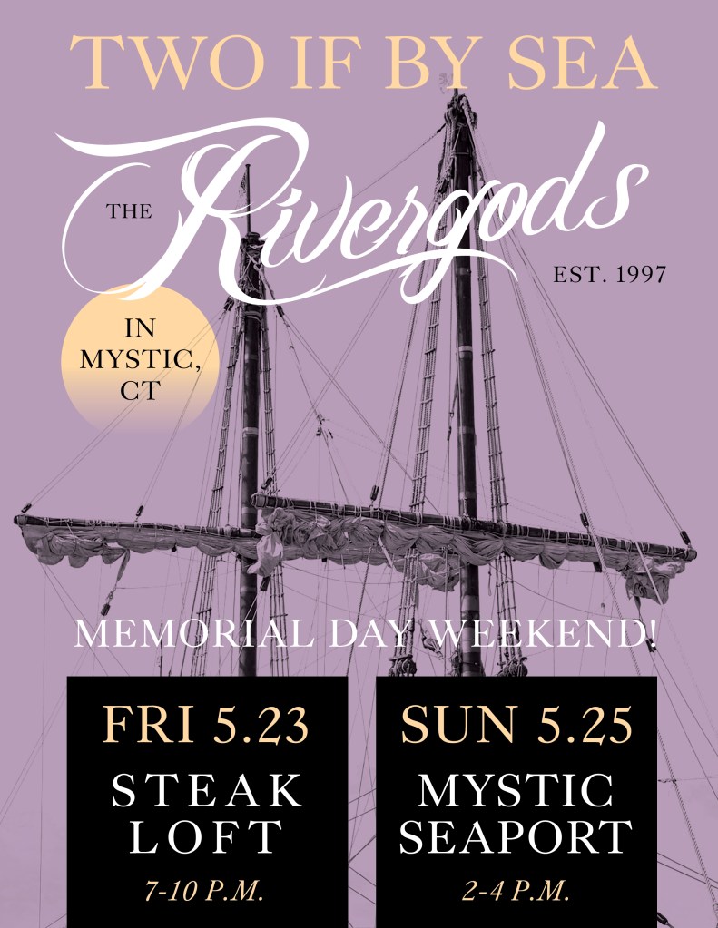 Two if by sea… one in the village by evening, one at the seaport by daylight! Sailors take warning… the Rivergods’ musical takeover of Mystic continues Memorial Day Weekend! We’ve got two great shows, one at the always swingin’ Steak Loft in Olde Mistick Village Friday, May 23 from 7-10pm. Then Sunday, May 25, we play 2-4pm at beautiful, historic Mystic Seaport, helping to kick off their Summer of the Morgan season! We’ll see you out there!