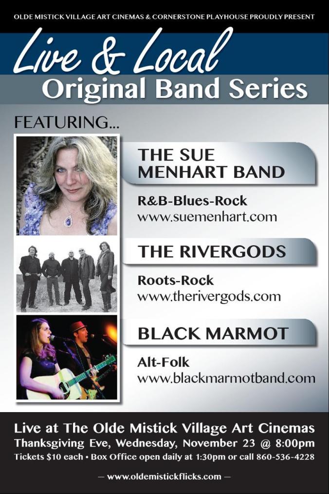 BIG SHOW! The Rivergods, Sue Menhart Band and Black Marmot kick of the Live and Local series Thanksgiving Eve at Mystic Art Cinemas. For the price of a movie ticket, sit back and enjoy three bands from the plush comfort of a movie chair. In addition to the music, Regan Enterprises of Groton, CT is giving away a trip to New York City to a lucky audience member the night of the show! Includes a one night stay at a posh hotel and two tickets to a Broadway show of your choice. HOLY SHIZ*R! Tickets for the show are $10, and available by calling the box office 860-536-4228 or at the door. Rivergods go on first at 8:30 pm. Here’s the full details: