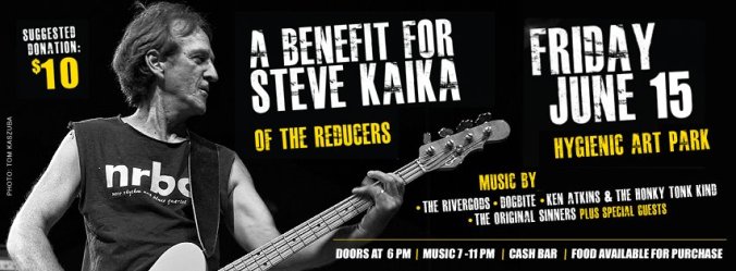 As many of you have surely heard, our friend Steve Kaika, bass player of the seminal New London band The Reducers passed away this week after a courageous battle with lung cancer. This Friday, June 15, the Rivergods join fellow New London bands Dogbite, Ken Atkins & the Honkytonk Kind and the Original Sinners for a memorial benefit concert at the Hygienic Art Park in New London, CT. Doors open at 6:00pm, with the music starting at 7pm. The Rivergods will close the show. A $10 donation is suggested, with all proceeds going to benefit Steve’s family. RIP Steve, we will never forget your sly smile, your amazing bass lines, and incredible 35 year contribution to the New London music scene.
